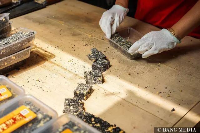 芝麻酥有白芝麻、黑芝麻两种。里面还有花生粒哦,超香的~全都是阿姨现场切的,看起来超爽!买了一盒带回家超酥脆!就是有点甜....感觉要配茶吃。